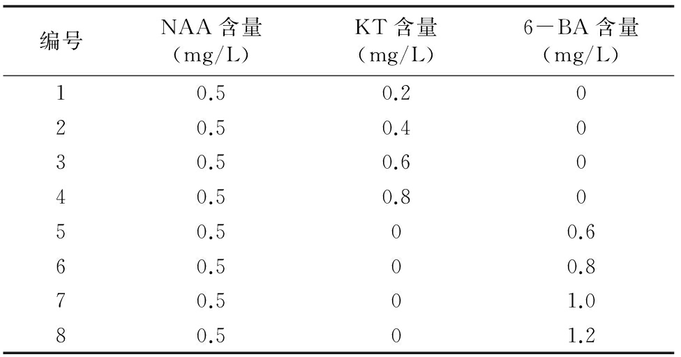 1.2.2 誘導分化培養基的選擇 在超凈工作臺上,將無菌苗置于無菌培養皿中,將無菌苗的葉柄切成1 cm左右的小段,隨后將葉柄接種于含有不同濃度生長調節劑的分化培養基(表1)中進行分化誘導培養,以篩選出誘導葉柄分化成不定芽的適培養基。每種培養基接種葉柄120個。