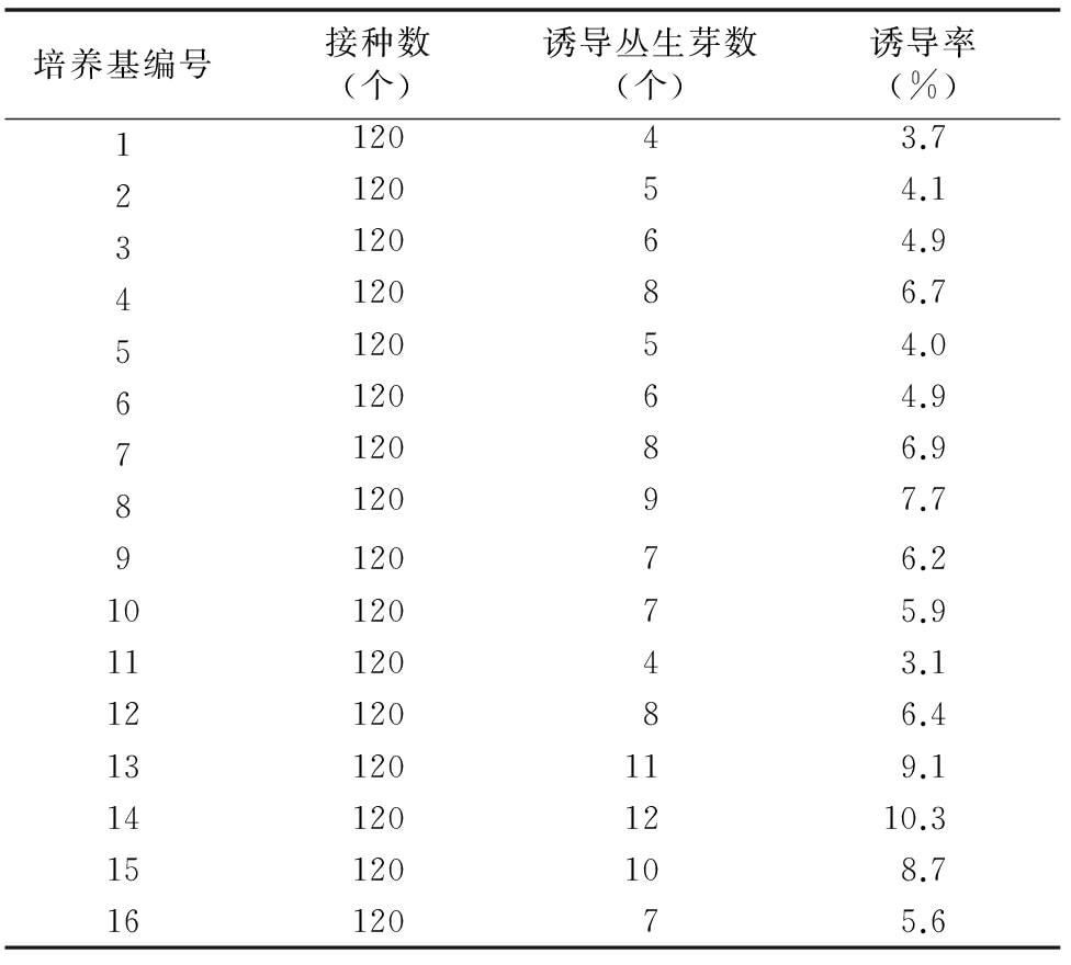1.2.3 高誘導率外植體的篩選 在超凈工作臺中,將無菌苗的下胚軸、葉柄、叢生芽塊均切成長約1 cm的小段,分別置于篩選出的佳不定芽誘導率培養基,根據不同類型外植體誘導率,確定誘導率高的培養基。3種不同類型的外植體均接種120個。