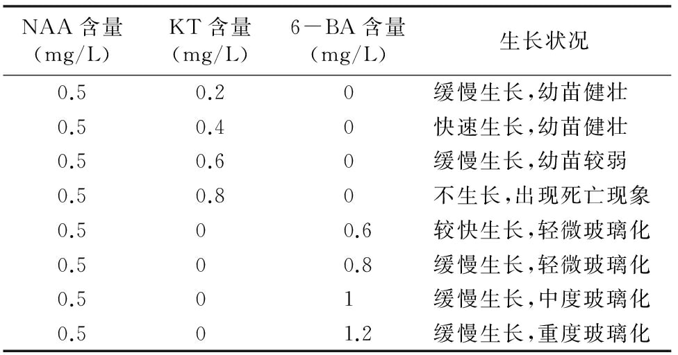 1.2.4 繼代培養基的選擇 當誘導的叢生芽長到約1 cm時,在超凈工作臺中將叢生芽分切為單苗,接種于繼代培養基中進行繼代培養(表2),根據不同培養基中幼苗生長情況,篩選佳繼代培養基。