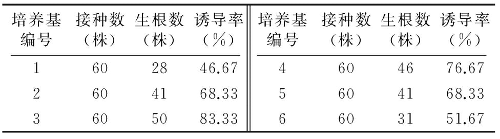將生長健壯的叢生芽接種在含有不同濃度NAA的誘導培養基中,由表6可知,當NAA低濃度時生根誘導率隨著NAA濃度的升高而增加,NAA濃度為1.2 mg/L時,誘導率高,達到83.33%。然而,隨著NAA濃度的持續升高,生根誘導率呈現下降的趨勢。因而確定佳生根培養基為MS+1.2 mg/L NAA。