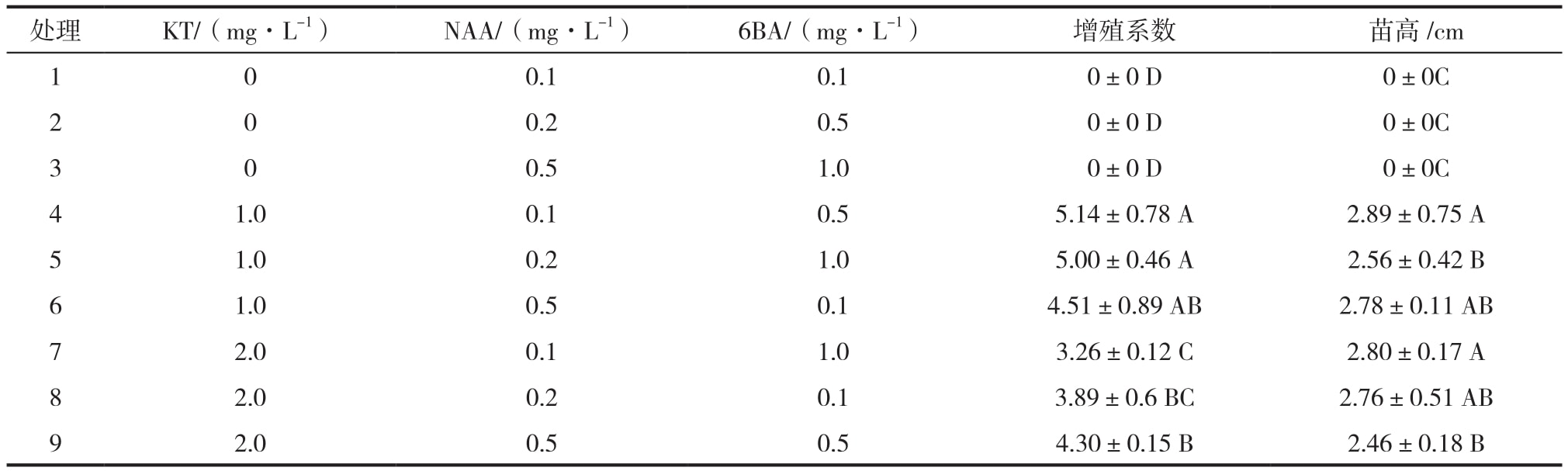 以MS為基本培養基,添加植物生長調節劑KT、NAA和6 BA,KT濃度設定為0、1.0、2.0 mg/L,NAA濃度設定為0.1、0.2、0.5 mg/L,6 BA濃度設定為0.1、0.5、1.0 mg/L。按照正交表 L9( 34) 設計成 9 種不同的處理。將誘導的芽單獨切離下來接種到培養基上,每個處理接種30個芽,分別接種在5個培養瓶中,每瓶接種6個芽,重復 3 次。30 d 后調查其增殖倍數和生長情況。